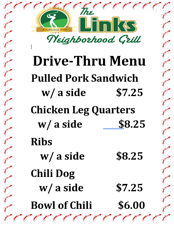 Links Grill Drive-Thru Menu at the Lakes - Saturday 4-6PM